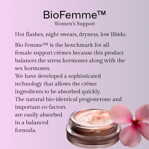 Hot flashes, night sweats, dryness, low libido. Natural bio-identical cr�me: progesterone, DHEA, pregnenolone and other co-factors that are easily absorbed that support healthy sex and stress hormones.