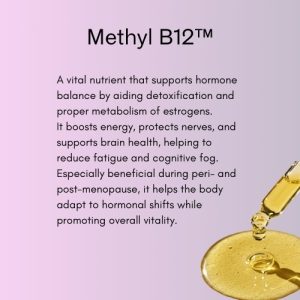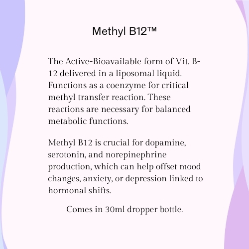 Methyl B12 is the Active-Bioavailable form of Vit. B-12 delivered in a liposomal liquid. Functions as a coenzyme for critical methyl transfer reaction. These reactions are necessary for balanced metabolic functions.